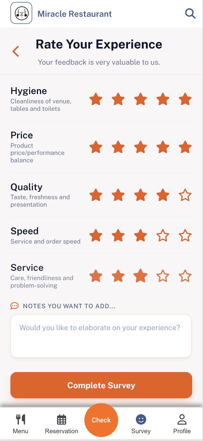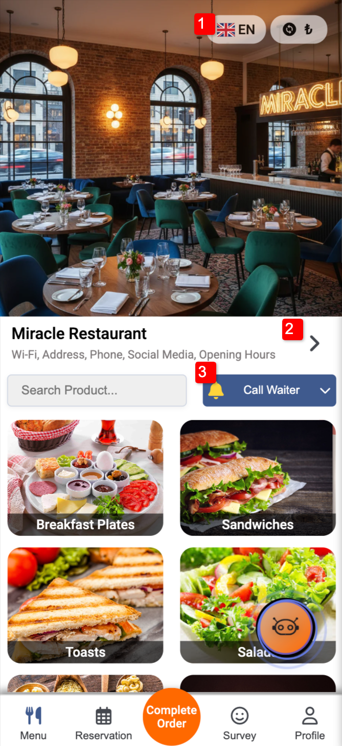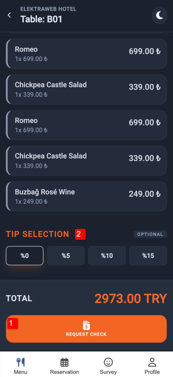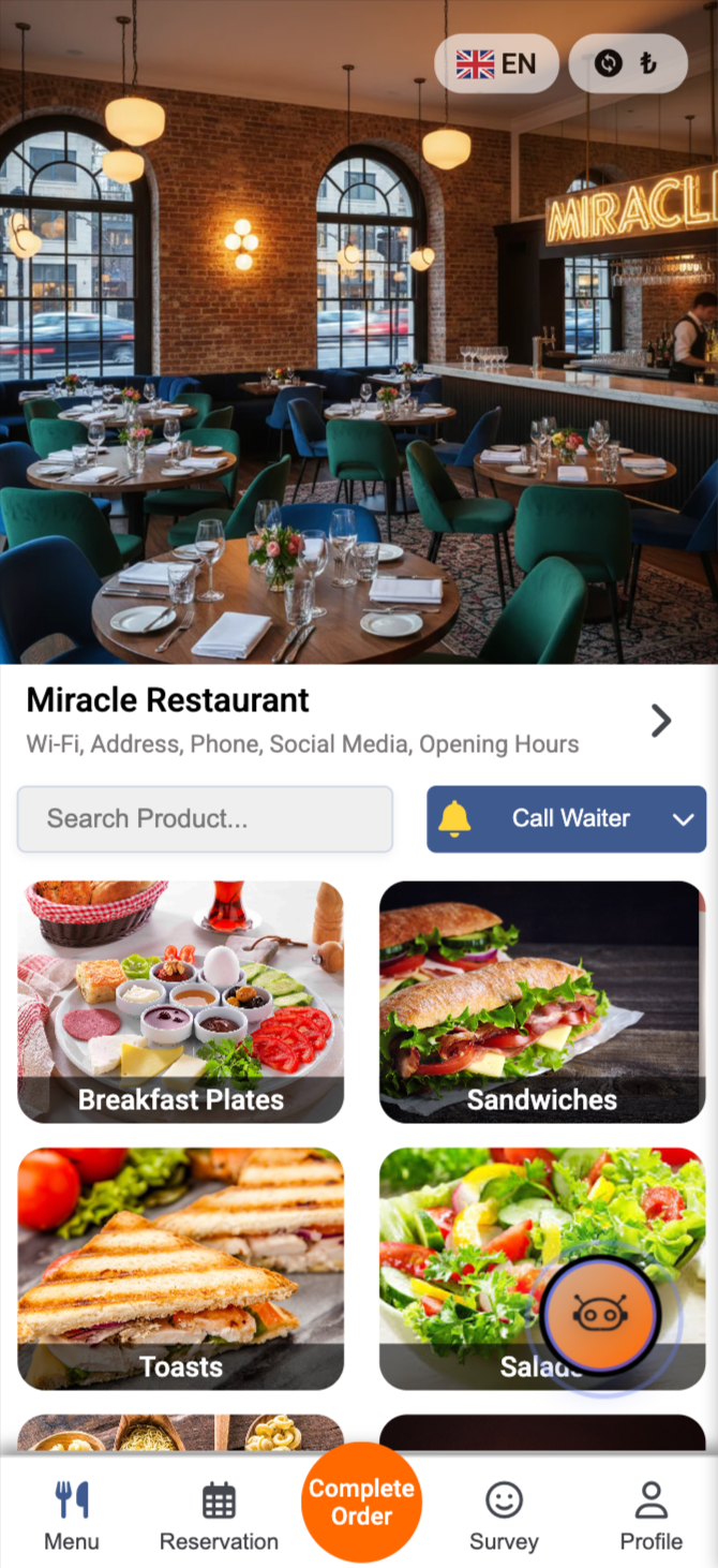 - 3. Guest-Waiter Communication At any time, guests can call a waiter, request the bill, or send a message to the waiter with a single tap.