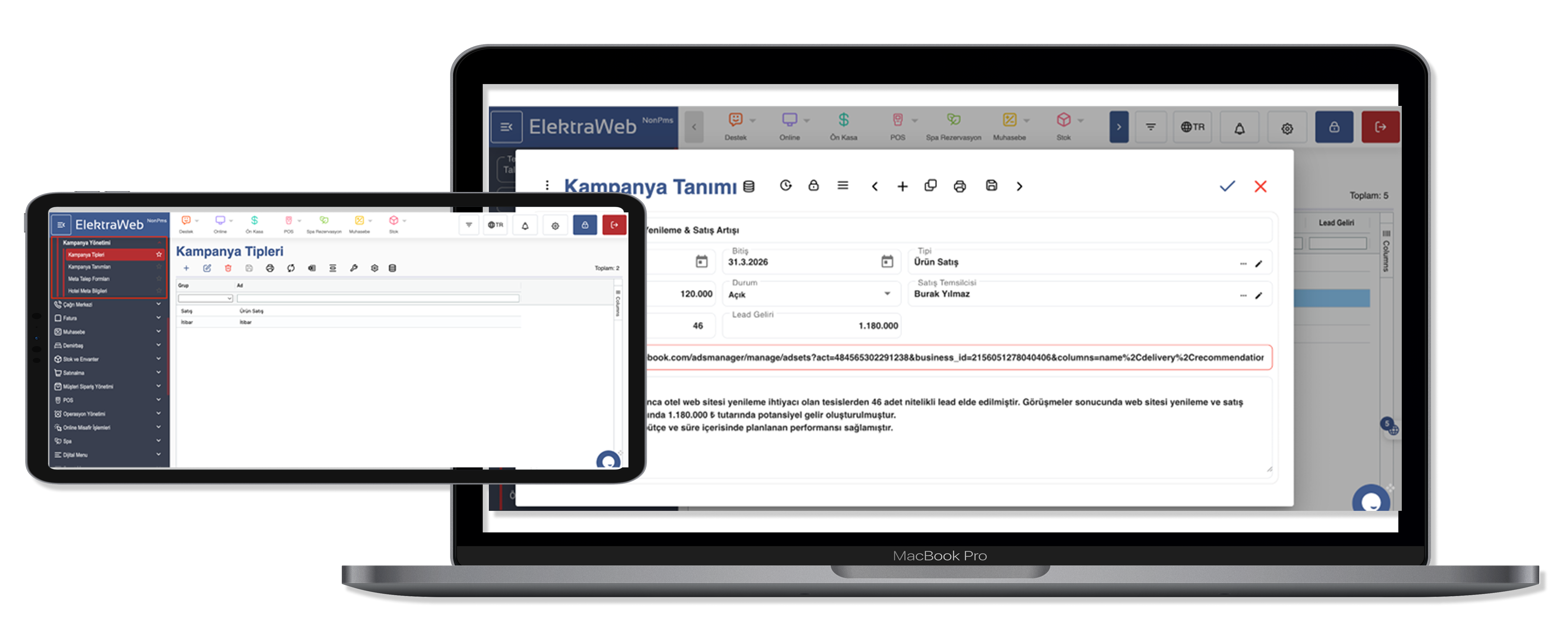 Kampanya yönetim sistemi, yalnızca manuel kayıtlarla sınırlı kalmayıp; Facebook, Instagram ve diğer dijital reklam platformları ile entegre şekilde çalışmakta, bu kanallar üzerinden elde edilen lead (potansiyel müşteri) verilerini de toplayarak sürecin uçtan uca izlenebilirliğini ve performans takibini sağlamaktadır.