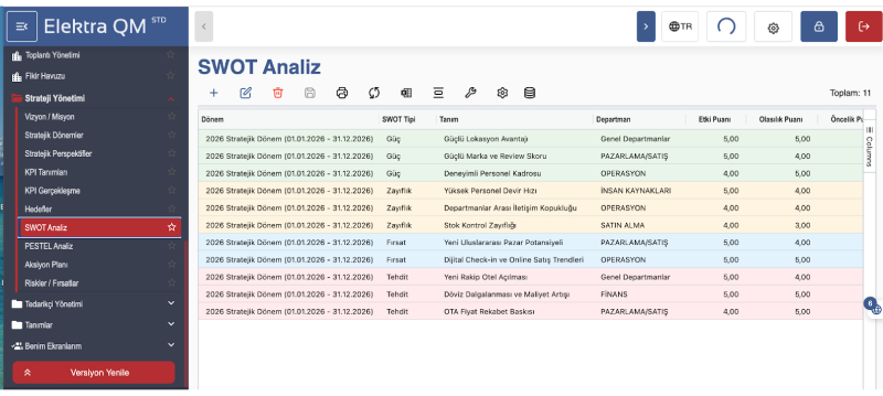 Strateji Yönetimi modülü yalnızca hedef takibi için değil; kurumsal gelişim, kalite yönetimi, yönetişim ve sürdürülebilir büyüme için de güçlü bir altyapı sunar. Özellikle çok departmanlı yapılarda, otellerde ve grup işletmelerinde stratejik planların merkezi bir sistem üzerinden yönetilmesi; karar alma süreçlerini hızlandırır, kurum içi uyumu artırır ve ölçülebilir sonuçlar üretir.