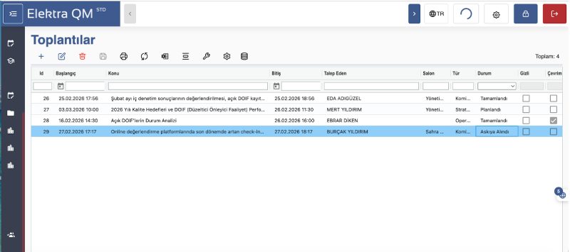 Elektraweb Kalite ve Denetim Yönetim Sistemi, diğer yönetim modülleri (IK, Şirketim, CRM, ERP vb.) ile veri alışverişi yapar, formlarda tanımlanan alanları otomatik olarak doldurur. Böylece çok daha hızlı, doğru ve pratik bir şekilde dokümanlarınız oluşur.