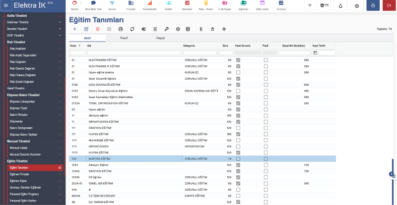 Eğitim Tanımları: Kurumda verilen tüm eğitimlerin türünü, süresini ve geçerlilik süresini belirler. Zorunlu, oryantasyon, dil veya kişisel gelişim eğitimleri bu ekrandan tanımlanır. Eğitim süreleri, kategori bazında yönetilir; sistem yasal zorunluluk uyarıları verir.