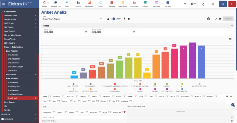 Ölçme ve Değerlendirme Yönetimi, kurumların ihtiyaç duyduğu sınav, form ve anket süreçlerini tek bir yapı altında toplayan kapsamlı bir yönetim modülüdür. Çalışan memnuniyetinden eğitim değerlendirmelerine, bilgi testlerinden operasyon formlarına kadar tüm ölçüm süreçleri dijital ortamda oluşturulur, uygulanır ve analiz edilir. Kullanıcılar, soru setlerini kolayca tasarlayabilir; sonuçlar ise gelişmiş filtreler, detaylı analiz ekranları ve rapor seçenekleriyle değerlendirilebilir. Bu yapı, kurumların veriye dayalı karar alma süreçlerini güçlendirir ve ölçümlerin düzenli, şeffaf ve yönetilebilir olmasını sağlar.