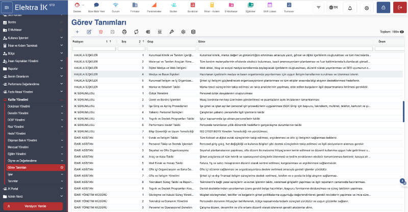 Kurum içinde yürütülen tüm süreçleri, görevleri ve operasyonel işleri net ve ölçülebilir standartlarla tanımlamak için kullanılır. Departmanlar, iş grupları ve görev süreçleri tek panelden yönetilir; çalışanların sorumluluk alanları, yapılacak işler ve süreç beklentileri dijital olarak kayıt altına alınır. Bu sayede iş akışları şeffaflaşır, performans ölçümü kolaylaşır ve operasyonel verimlilik artırılır.