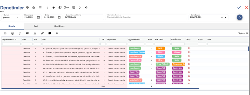1. Denetim Form Tanımı: Bu ekran ile denetim türü (Enerji, Finans, Gıda Hijyeni, Güvenlik, İnsan Kaynakları, Sürdürülebilirlik vb.) seçilerek soru setleri oluşturulur. Her soru için departman, lokasyon, ağırlık puanı, uygulanmama durumu gibi parametreler tanımlanır. Bu yapı sayesinde farklı denetim standartları kurumun kendi ihtiyaçlarına göre özelleştirilebilir.