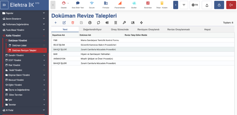 Elektraweb Kalite ve Denetim Yönetim Sistemi, diğer yönetim modülleri (IK, Şirketim, CRM, ERP vb.) ile veri alışverişi yapar, formlarda tanımlanan alanları otomatik olarak doldurur. Böylece çok daha hızlı, doğru ve pratik bir şekilde dokümanlarınız oluşur.