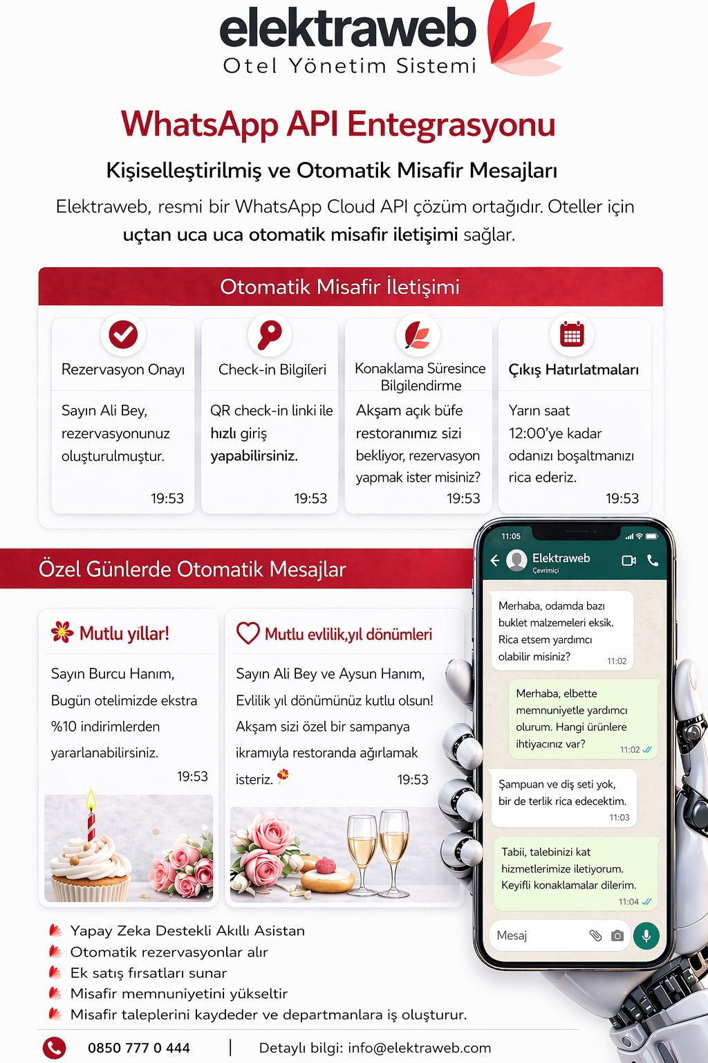 Buna ek olarak, Elektraweb yapay zekâ destekli akıllı asistan sunmaktadır. Bu akıllı asistan, otelin bilgi dosyası (fact sheet) ile eğitilerek misafirlerin WhatsApp üzerinden yönelttiği sorulara anında, %100 doğru ve pozitif yanıtlar verir. Bu sistem, doğrudan rezervasyonları artırır, ek satış fırsatları sunar ve misafir memnuniyetini önemli ölçüde yükseltir.