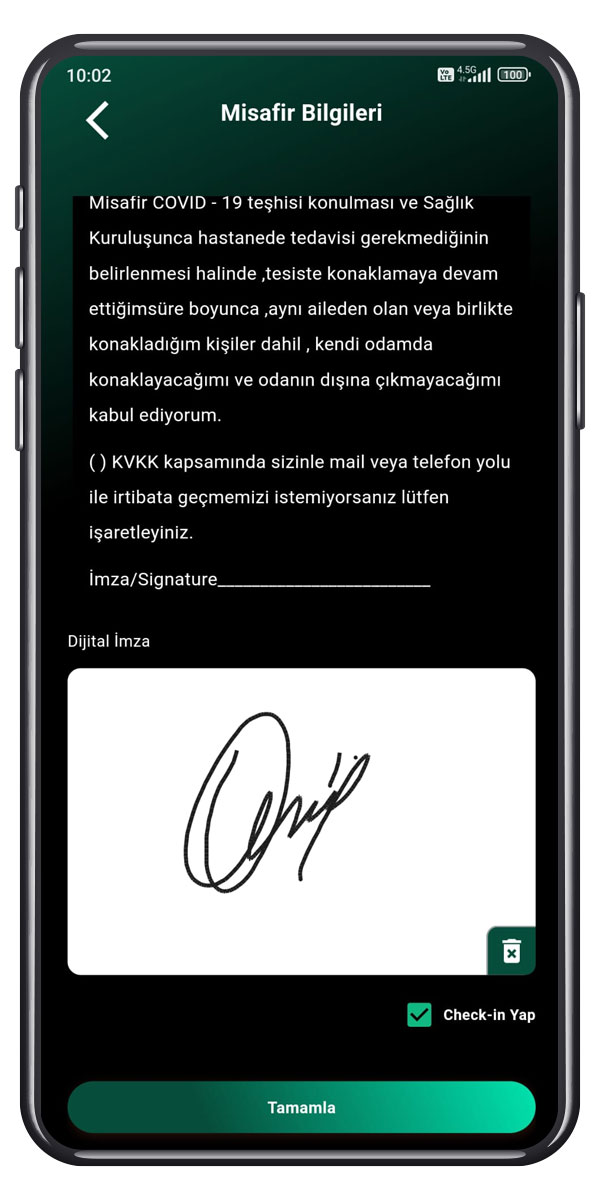 Misafirin iletişim bilgileri sisteme kaydedilir. Dijital kayıt formu ekranda görüntülenir ve misafirin onayı için dijital imzası alınır. Kimlik görseli ve imzalı form güvenli bir şekilde sisteme eklenir.