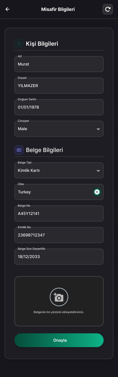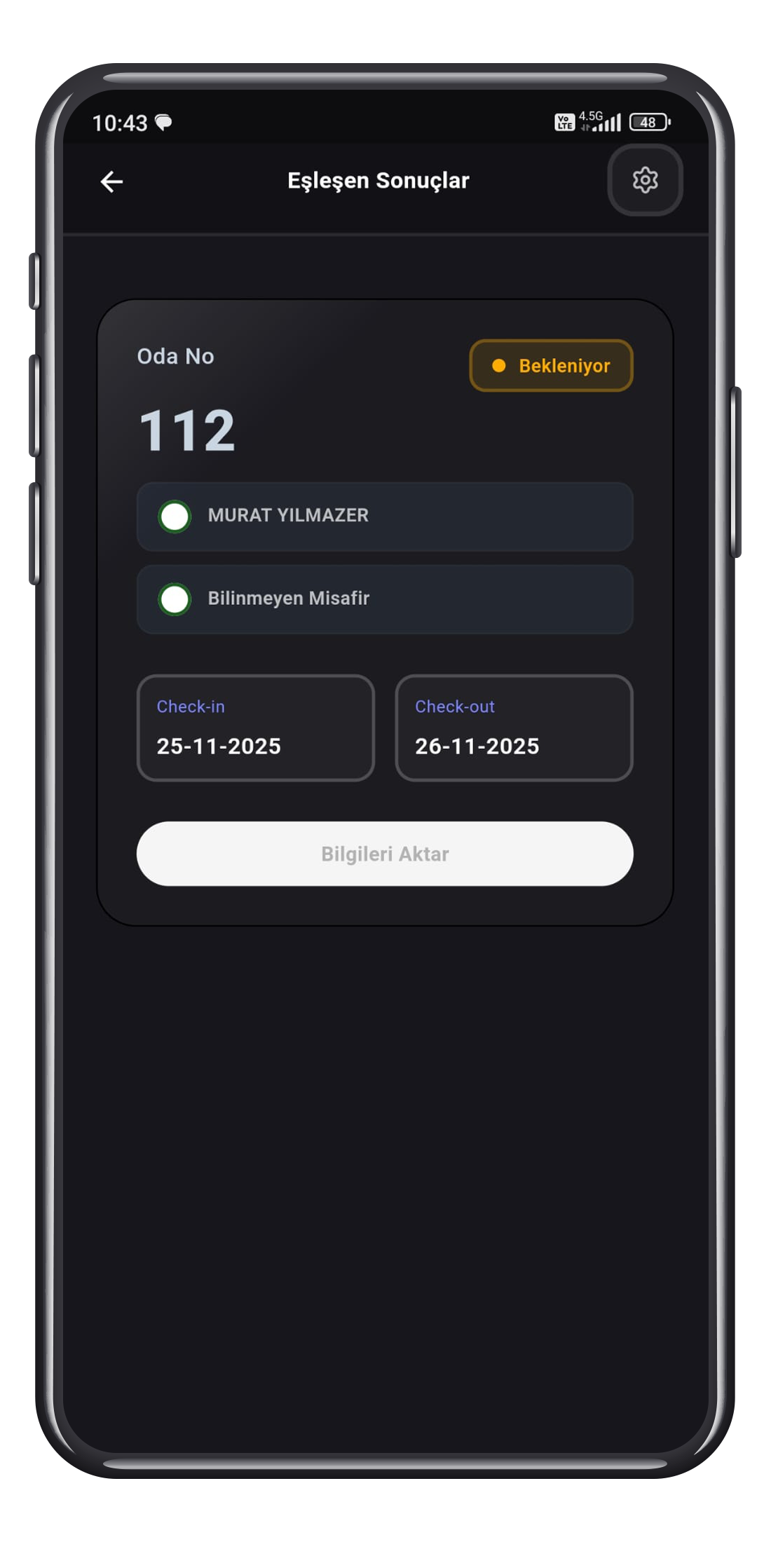 Okutulan kimlik bilgisiyle eşleşen bir rezervasyon varsa, misafir kartı otomatik olarak doldurulur ve doğrudan Elektra PMS sistemine aktarılır. Zaman kaybı yok, manuel giriş hatası yok.