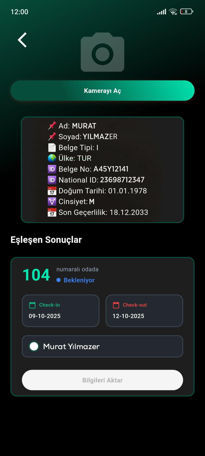 Okutulan kimlik bilgisiyle eşleşen bir rezervasyon varsa, misafir kartı otomatik olarak doldurulur ve doğrudan Elektra PMS sistemine aktarılır. Zaman kaybı yok, manuel giriş hatası yok.