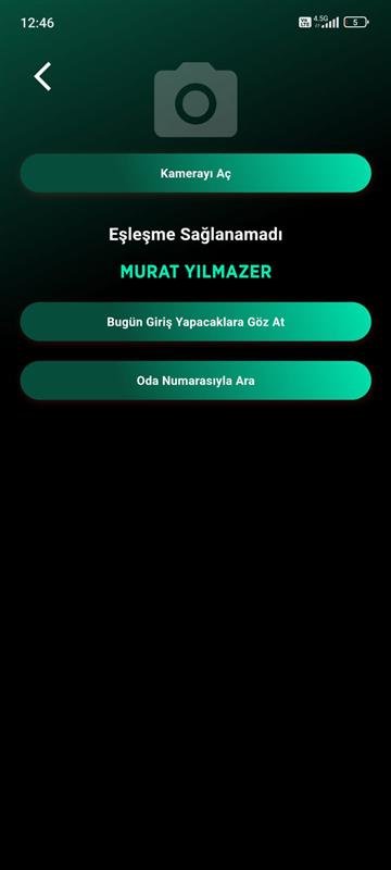 Misafir ismi bulunamazsa, kullanıcı oda numarası girerek ya da bugünkü giriş listesinden kişiyi seçerek işlemi tamamlayabilir. Sistem, oda numarasıyla arama ve bugünkü rezervasyonları listeleme seçeneklerini sunar.