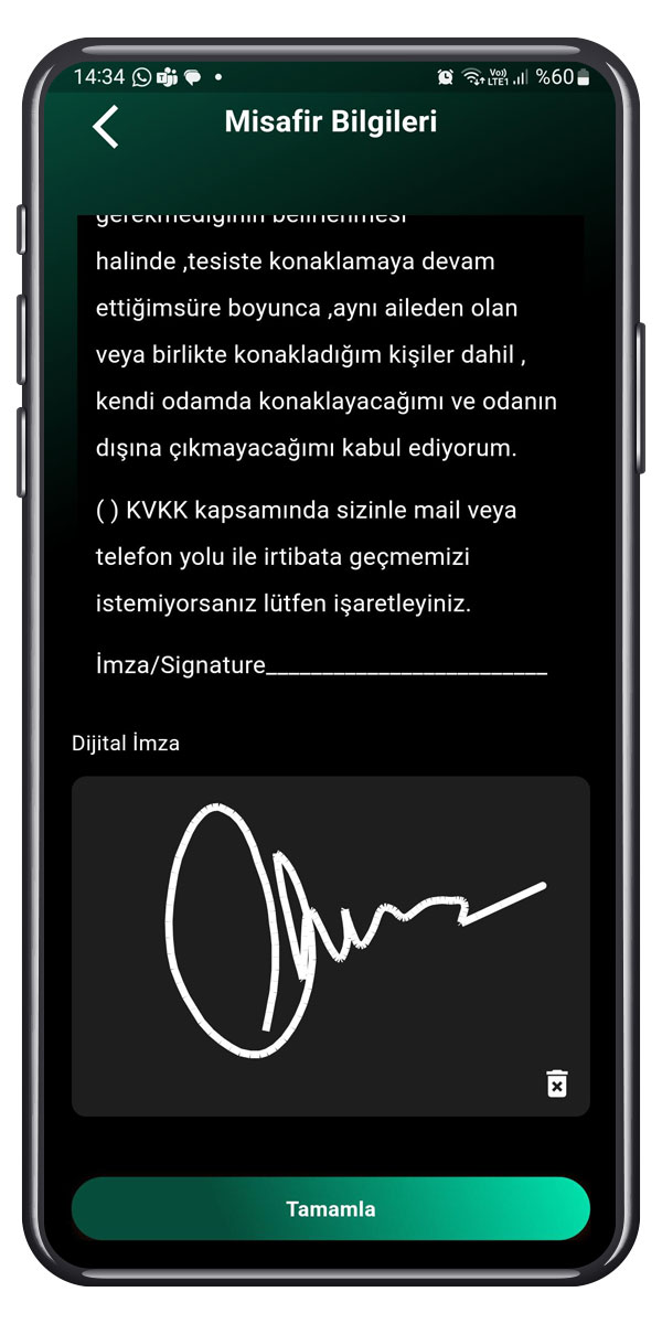 Misafirin iletişim bilgileri sisteme kaydedilir. Dijital kayıt formu ekranda görüntülenir ve misafirin onayı için dijital imzası alınır. Kimlik görseli ve imzalı form güvenli bir şekilde sisteme eklenir.